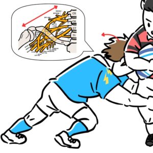 アメリカンフットボールやラグビーなどでの頚部の側屈強制、肩の下制強制に伴って生じるスポーツ外傷です。以下の3つの受傷メカニズムが考えられています。